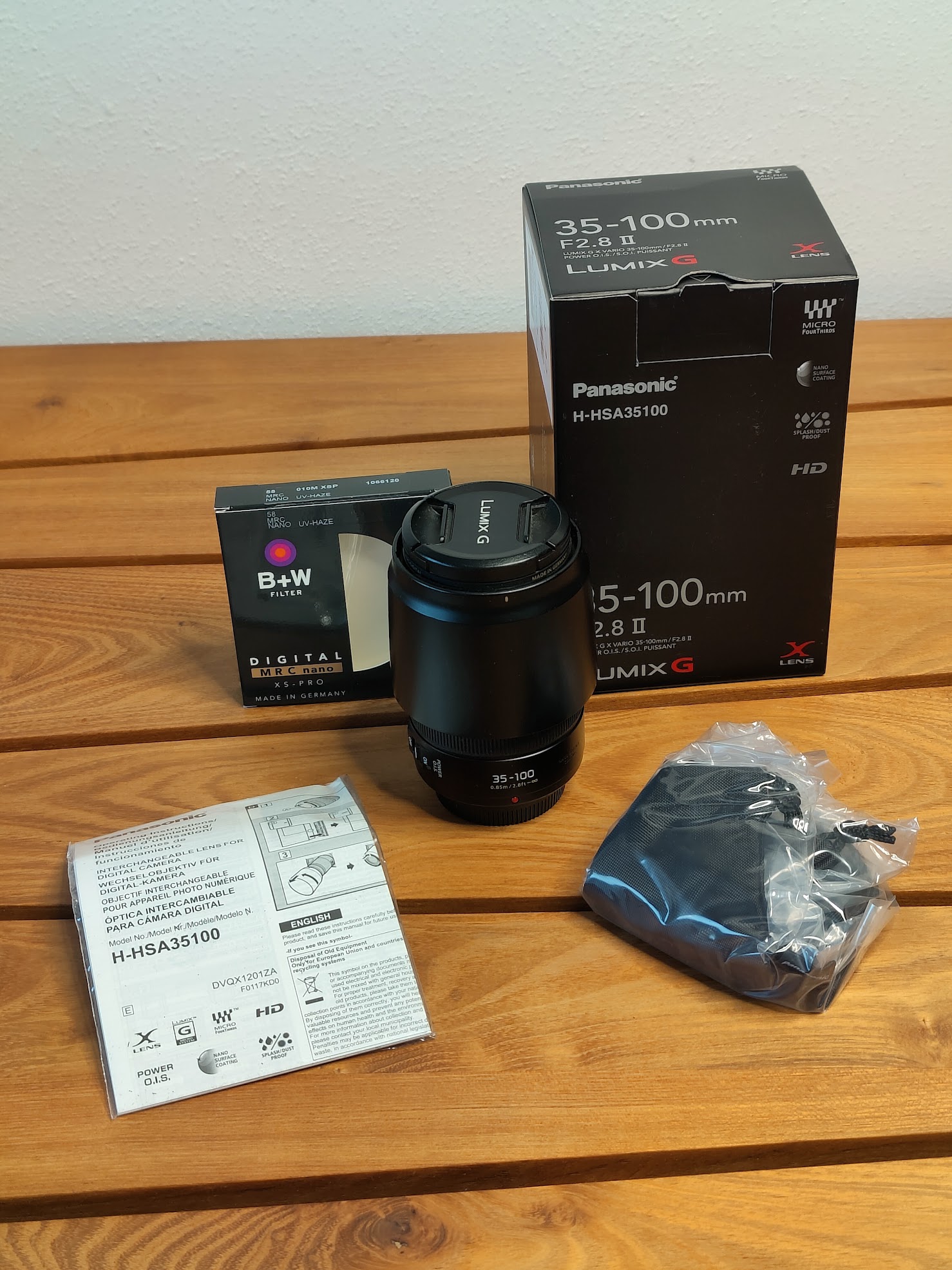 Panasonic Lumix G Vario 35-100 mm F/2.8 G Aspherical OIS Objektiv + Zubehörpaket
